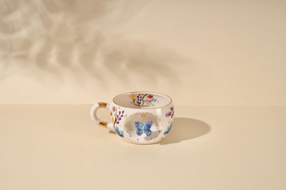 يتميز الكوب بتعليقات فراشه متأرجحه يضيف طابعًا شخصيًا خاصًا، مما يجعله مثاليًا لك أو كهدية تحمل معنى مميزًا لمن تحب.